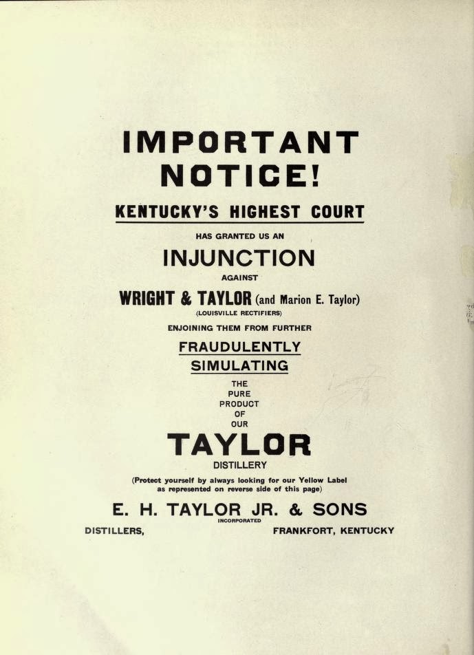After establishing this distinction and comparing the advertisements used by E. H. Taylor and Marion Taylor, the Court concluded that consumers who were “not familiar with the whisky trade would understand that ‘Old Kentucky Taylor’ was a straight whisky.”  The Court further concluded that Marion Taylor intentionally misled consumers through his advertising by trying to pass off his blended product as E. H. Taylor’s straight bourbon, “which had attained a very high reputation as a pure Kentucky distilled whisky.”
