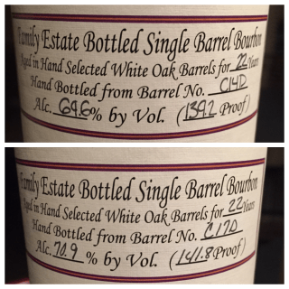 Luckily, my timing was perfect at the Gift Shop on several occasions, and I was able to buy multiple bottles from two different 22-year old barrels, both with wheat as the secondary grain. I tend to think that wheated Bourbons often take extra aging better, so I was very excited for these purchases, despite the retail price. Were they worth it?